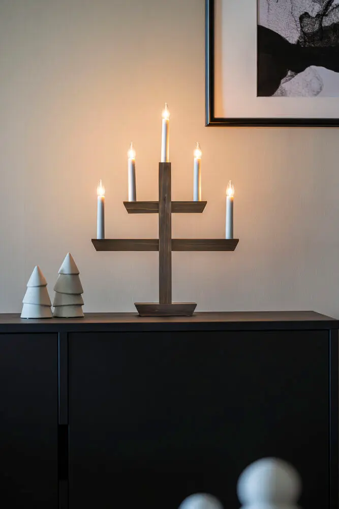 - Stilren adventsljusstake i betsat trä som skapar en varm och inbjudande känsla i vintermörkret. Med fem ljus och en klassisk design är den lika vacker i fönstret som på bordet – en tidlös julfavorit som sprider ljus och hemtrevnad år efter år.
