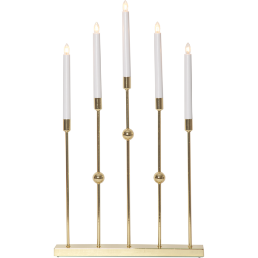 Stilren adventsljusstake i metall. Färgen är mässings. Ljusstaken har 5 ljuskällor med mysigt sken. Placera i ett förnster eller på en skänk, passar utmärkt till advent och jul.
