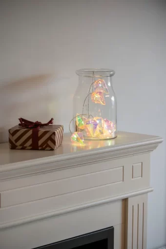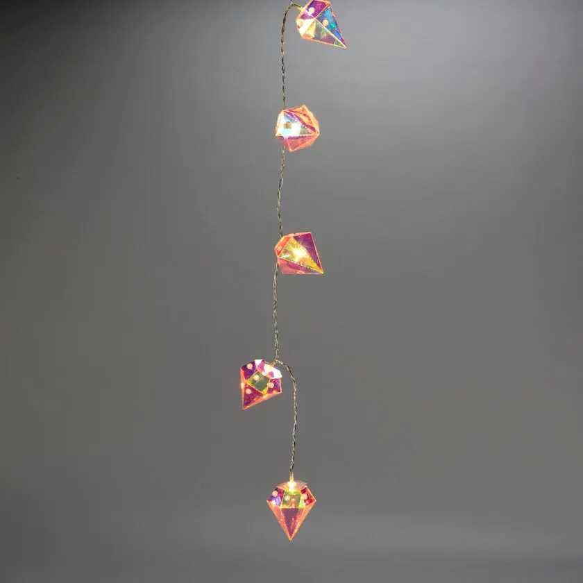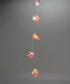 - Låt ditt hem glänsa med en batteridriven ljusslinga med 10 LED-lampor. De unika diamantformerna med prismaeffekt ger ett vackert, gnistrande sken som sprider en exklusiv känsla – perfekt för att förstärka stämningen vid festliga dukningar eller som dekorativ detalj. Tack vare smart timerfunktion och batteridrift är den enkel att placera var som helst, helt utan sladdtrassel. Skapa en magisk och elegant atmosfär som passar lika bra för mysiga vardagsstunder som för festliga tillfällen.