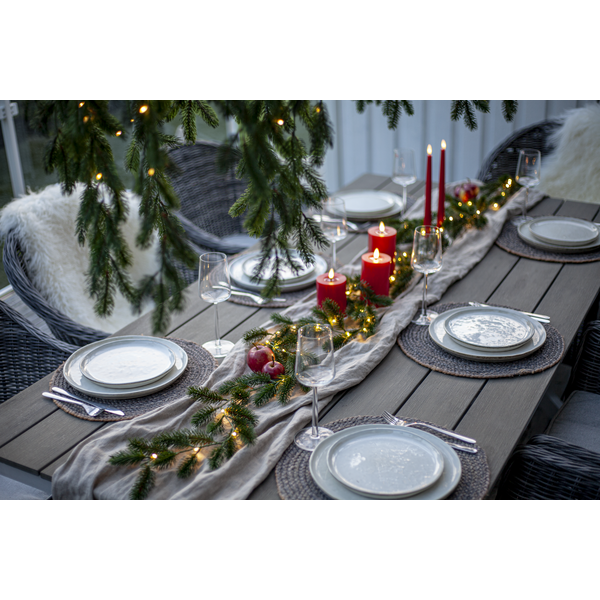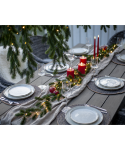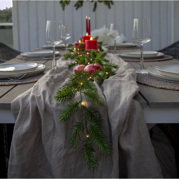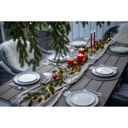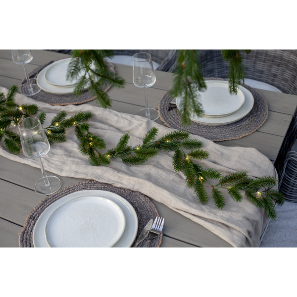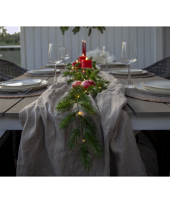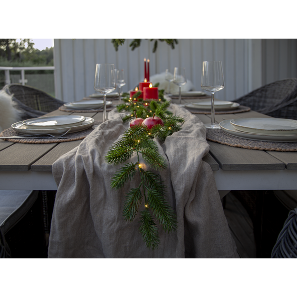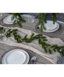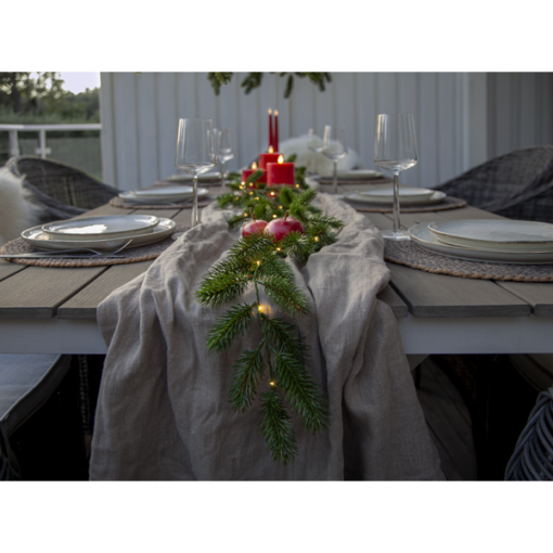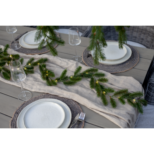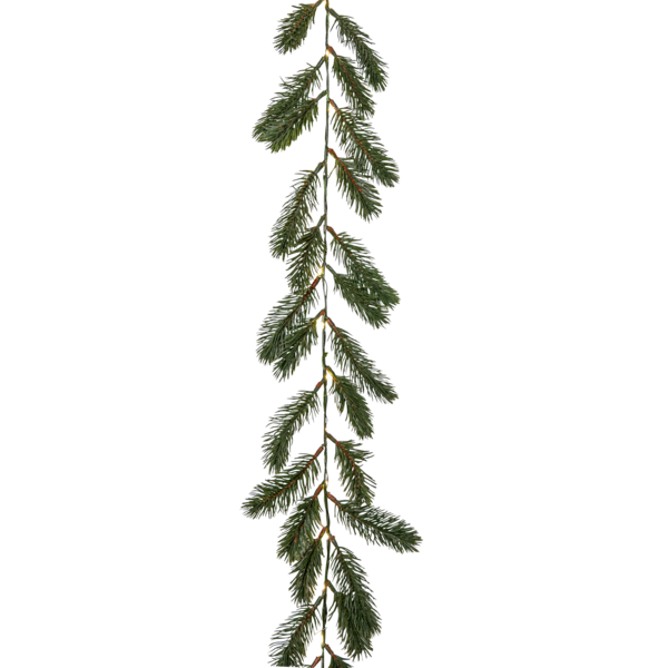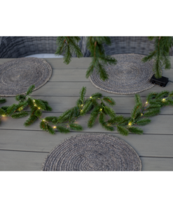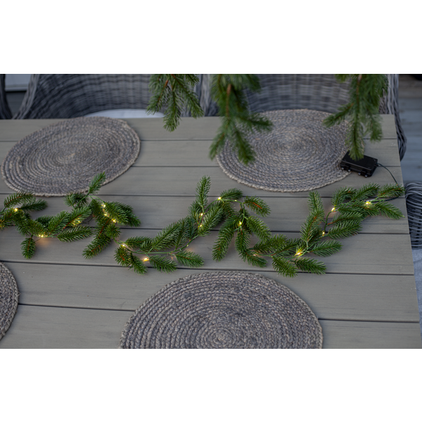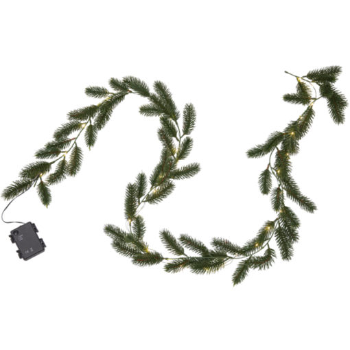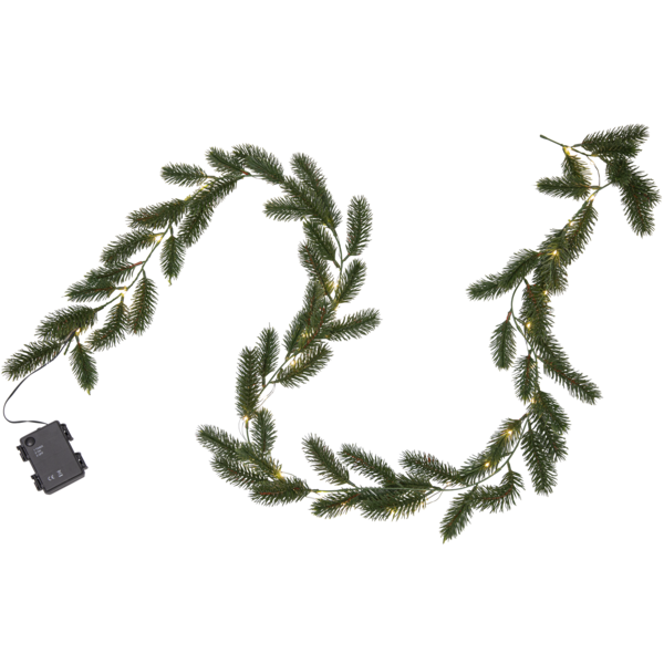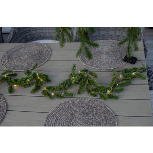 Erna är en vacker girlang med mörkgröna barr gjorda i PE material som ser mycket naturtrogna ut. Den är 180cm lång och lyser upp med 30 varmvita dew-drop led. Drivs av 3 AA batterier och har inbyggd timer. Batterier ingår ej.