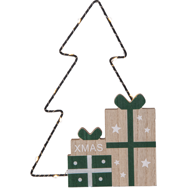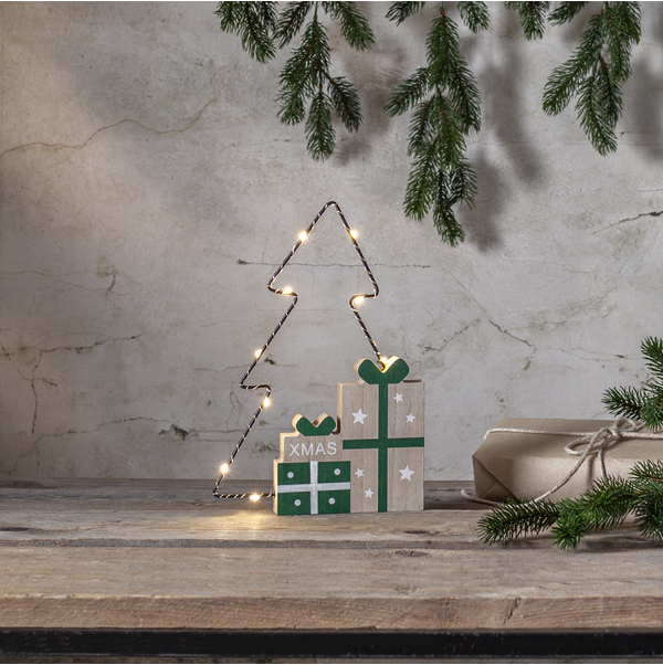 Fin juldekoration. Siluett i metall formad som en julgran med tillhörande fint målade paket i trä. Det lyser fint i siluetten från de små virade ledpunkterna. Placera den på en hylla eller i ett fönster, drivs av batteri.