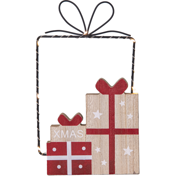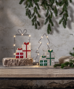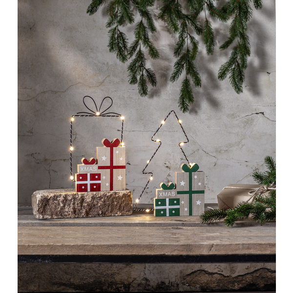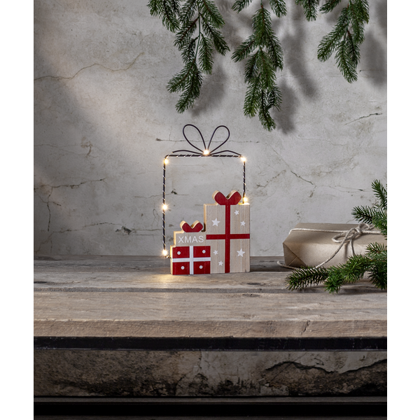 Fin juldekoration. Siluett i metall formad som ett paket med tillhörande fint målade paket i trä. Det lyser fint i siluetten från de små virade ledpunkterna. Placera den på en hylla eller i ett fönster, drivs av batteri