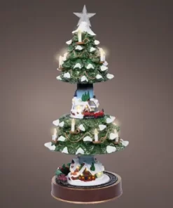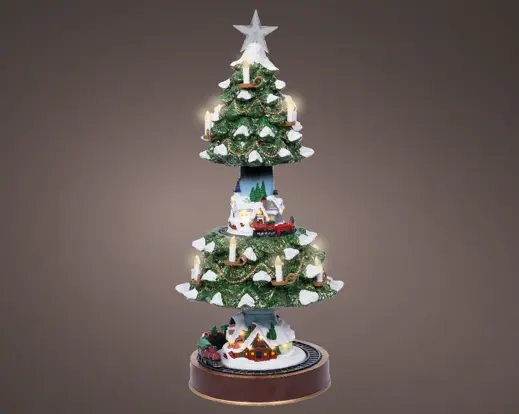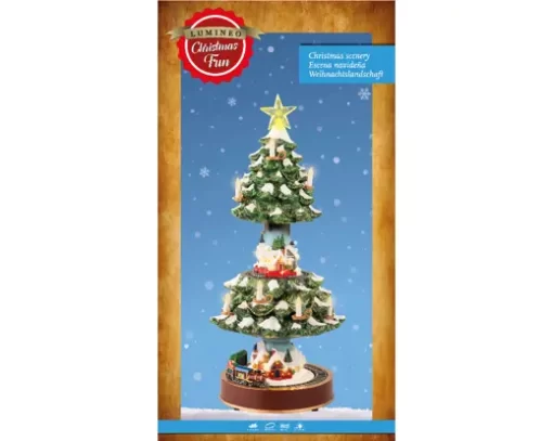 Mekanisk Julgran som öppnas och stängs. Mysig liten julby som exponeras när granen öppnar sig. Belysning i varmvitt sken.
