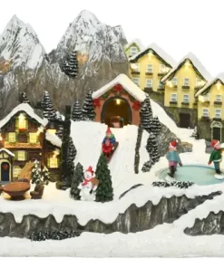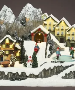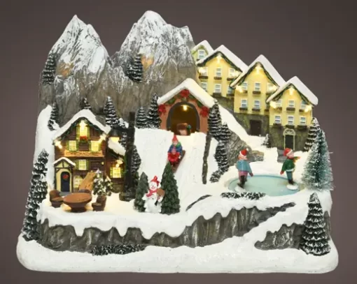 Mysig Julby med Alptoppar och åkande skridskobarn. Musik Jinglebell och belysning ger en härlig julstämning i hela hemmet.
