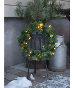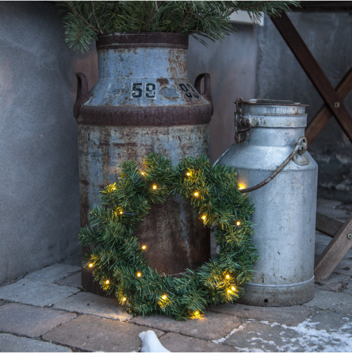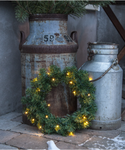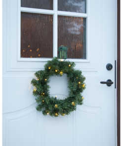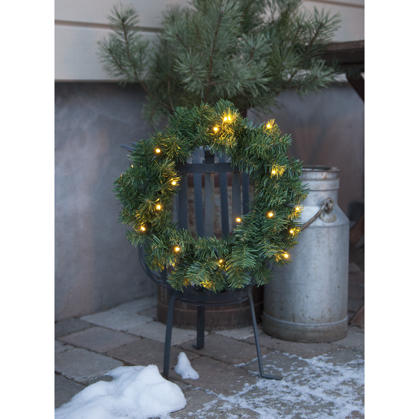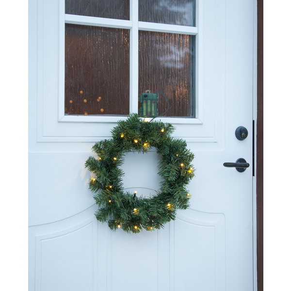 Batteridriven krans med 20 varmvita LED-lampor. Kransen ger ett fint och inbjudande sken i mörkret. Den inbyggda sensorn tänder kransen när det blir mörkt och släcker den när det ljusnar.
