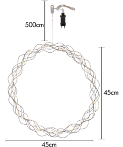 Dekorativ krom/silver krans med dew drop ljusslinga för inomhusbruk. Kransen har 40 LED-ljuspunkter med varmvitt sken. Dimmer i tre steg och timer .Fin dekoration att hänga i fönstret.