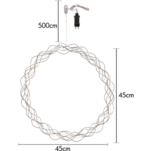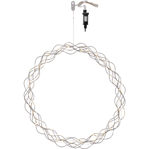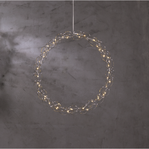 Dekorativ krom/silver krans med dew drop ljusslinga för inomhusbruk. Kransen har 40 LED-ljuspunkter med varmvitt sken. Dimmer i tre steg och timer .Fin dekoration att hänga i fönstret.