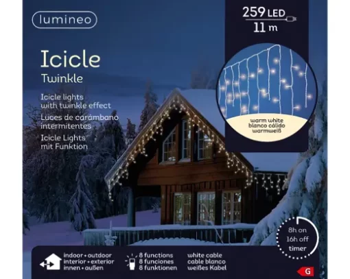 Snygg och prisvärd istappsslinga som klarar det nordiska klimatet bra och lyser fint år efter år. 8 olika glittrande effekter och timer på 8 timmar. Ej vidarekopplingsbar.