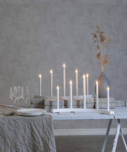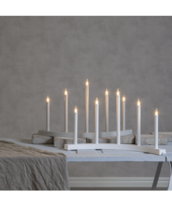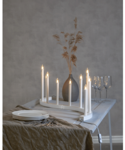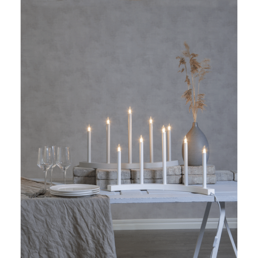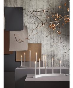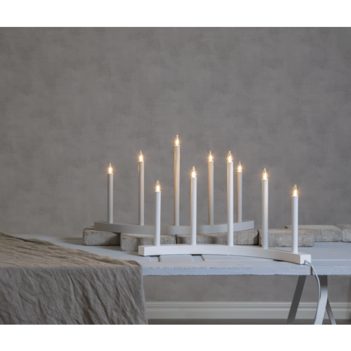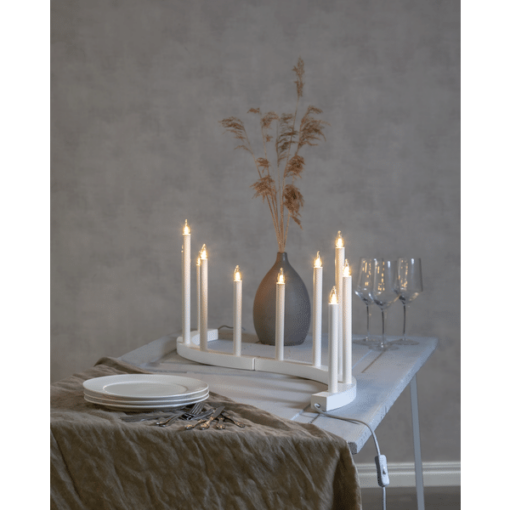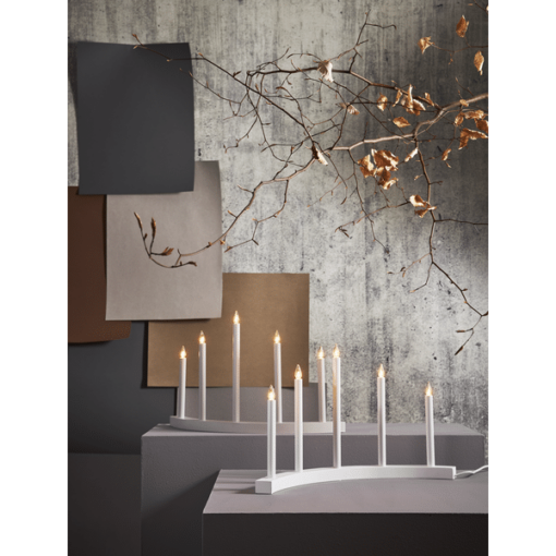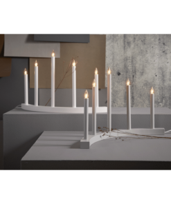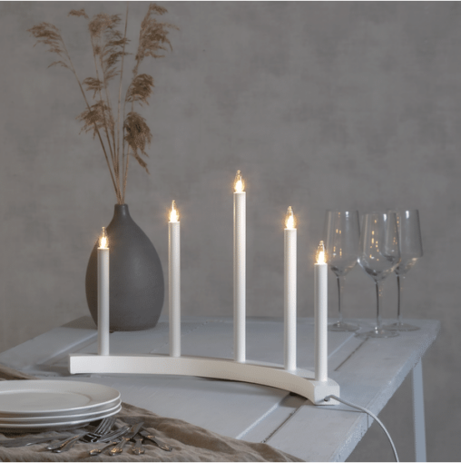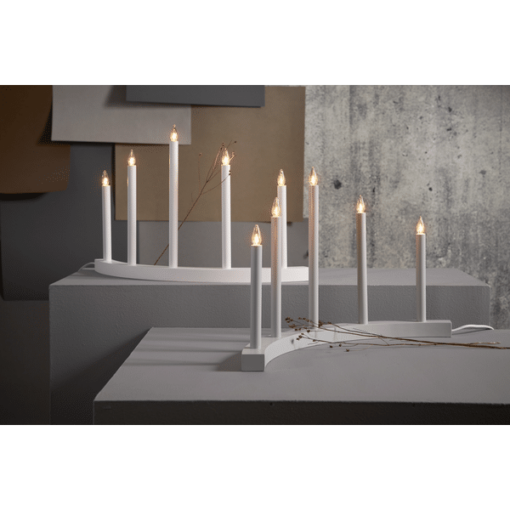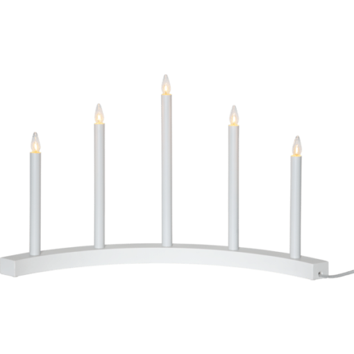 Stilren ljusstake, träbasen har en elegant böjd form. 5 ljuskällor med målade ljuspipor i metall. Bas och ljuspipor i vitt. Ljusstaken ger ett stämningsfullt ljus i både hemmet och offentlig miljö.
