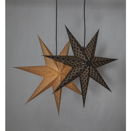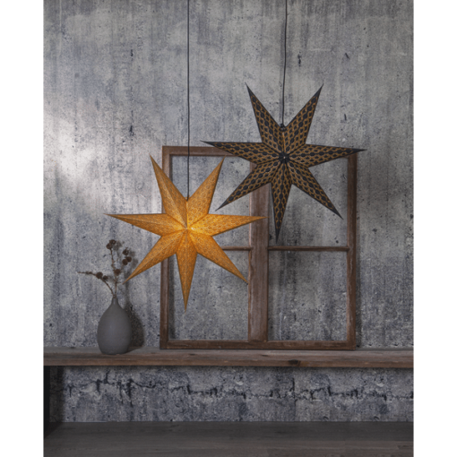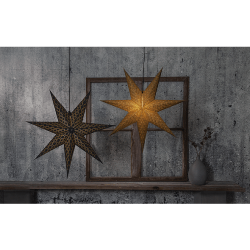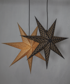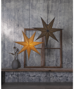 Dekorativ pappersstjärna i guld, 7 armad stjärna med guld broderi. Pappret i stjärnan är gjort av återvunnen bomull. Ger ett elegant och exklusivt intryck. Kan användas både med och utan belysning.