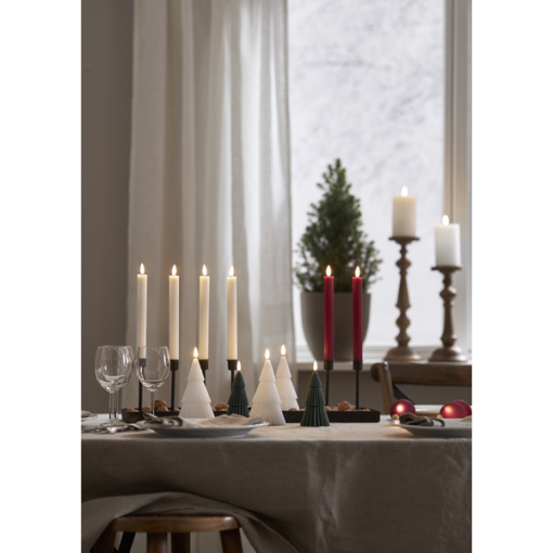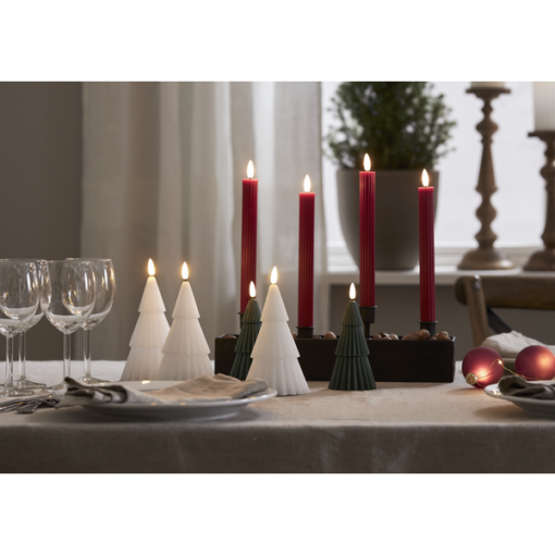 2 pack djupt röda antikljus i vår Flamme Stripe serie, gjorda i vax i med en räfflad-randig yta. Ljusen har en mycket naturtrogen låga som lyser med varmvitt sken. De har timerfunktion vilket gör att ljusen lyser i 6h per dag i ca 30 dagar. De drivs av 2 AAA batteri för varje ljus, dessa ingår ej. Dessa ljus har en silikonbelagd fot som gör att ljusen står stadigare i ljushållaren.