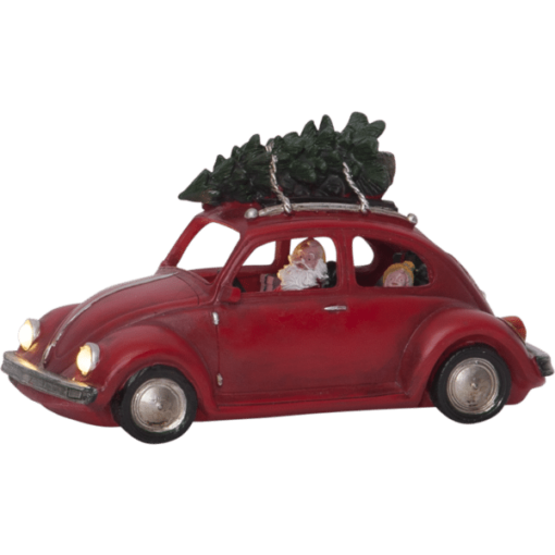 Dekorativ julbil, jultomten sitter i och granen ligger på taket. Lyser i strålkastarna fram på bilen. Placera på ett bord eller på en hylla och få en härlig julkänsla.