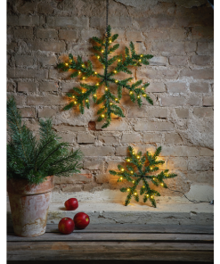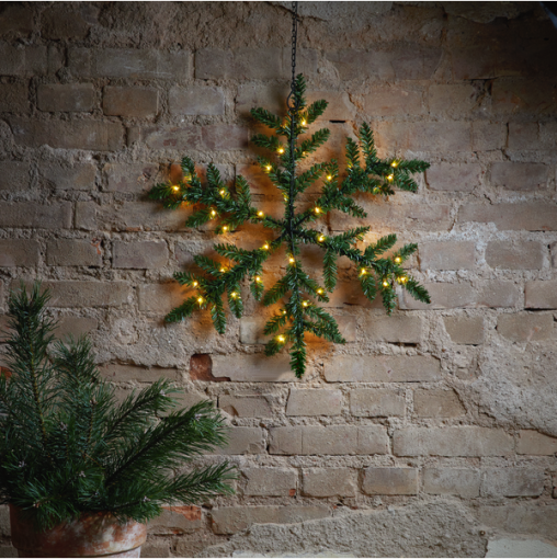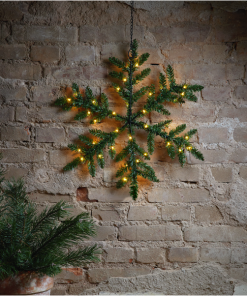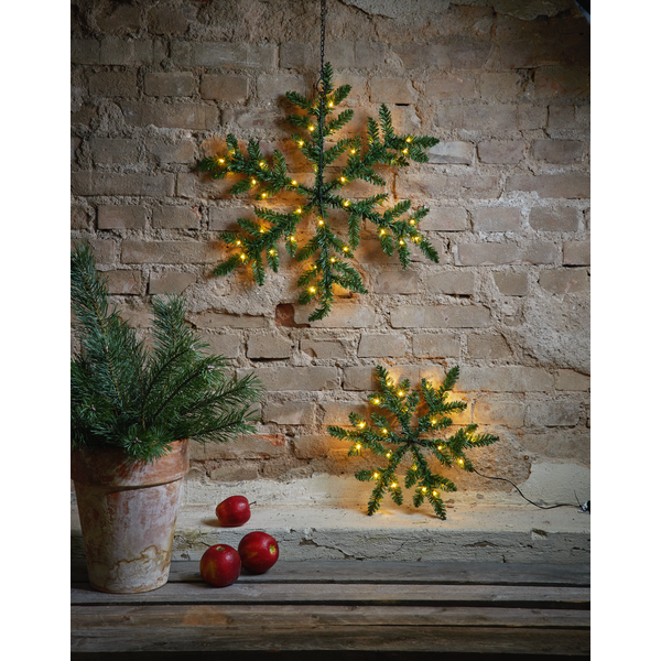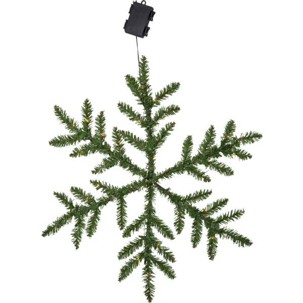 Snowflake dekoration blir en vacker prydnad på en ytterdörr utomhus eller i ett fönster inomhus. Barren är gjord av Rohs och REACH godkänd PVC som sitter monterade på en metallstomme. Med små varmvita ljuspunkter lyser den upp fint i mörkret. Denna krans går bra att använda både inomhus och utomhus. Den drivs av 3 AA batterier och har även timerfunktion och när brytaren är på timerläget lyser snöflingan i ca 25 dagar. Batterier ingår ej.