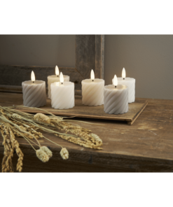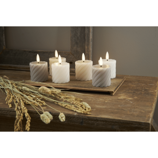 Vitt votivljus i 2 pack med twist formad vax i vår Flamme serie. Den naturtrogna lågan lyser med ett varmvitt sken. Med inbyggd timer. Höjd på ljusen med låga ca 7,5cm.