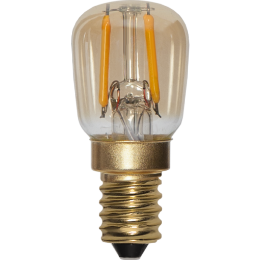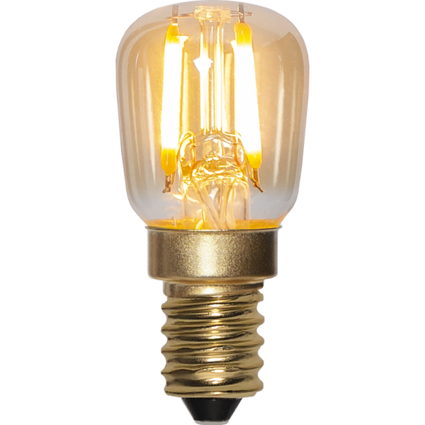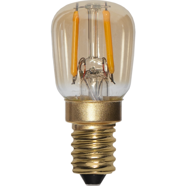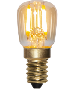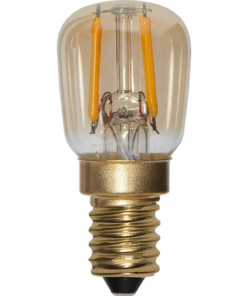 Päronlampa med amberfärgat glas och E14-sockel. Den har låg lumen och varm färgtemperatur.