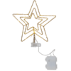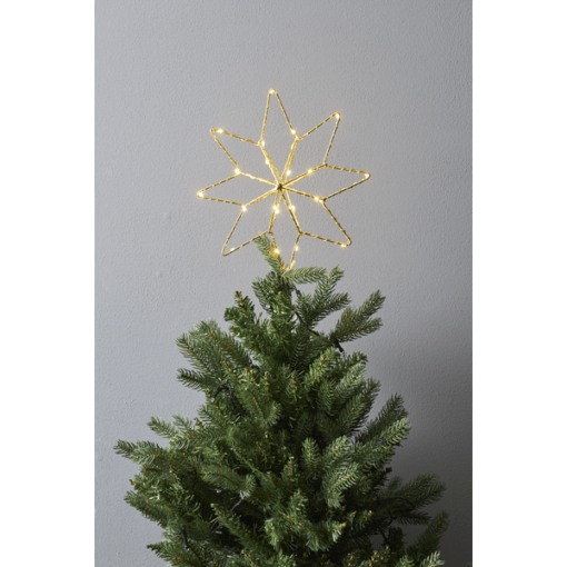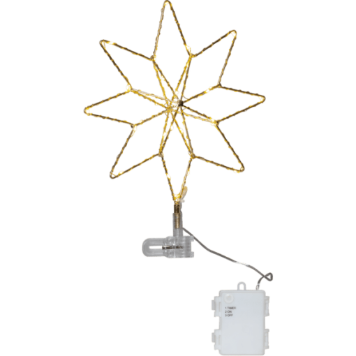 Stilren toppstjärna med varmvitt sken som passar perfekt på julgranen. Batteridriven och med klämma för enkel montering på julgranen.