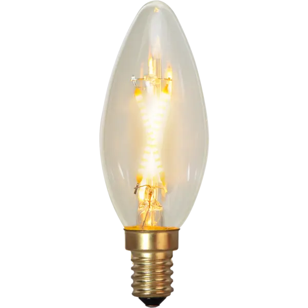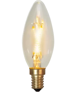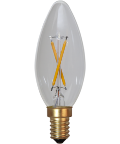 Kronljuslampa med mycket lågt lumen. E14-sockel och färgtemperaturen är 2100K. 2 filament i kors ger ett mysigt och varmt sken!