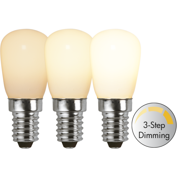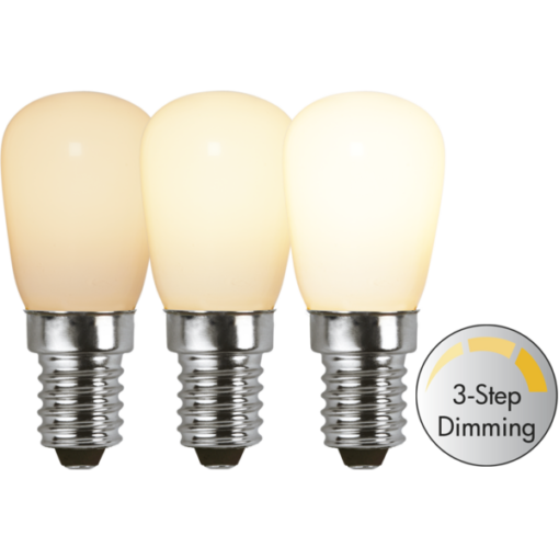Päronlampa med 3-stegs klickdimring! Ljusstyrkan ändras enkelt genom slå av och på strömbrytaren. Välj mellan 15lm, 80lm eller 150lm. Ljusfärgen är 2700K och den har E14-sockel. Startar alltid på lägsta ljusstyrka.