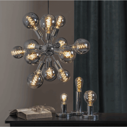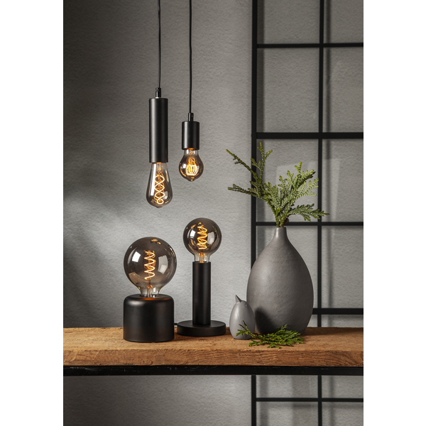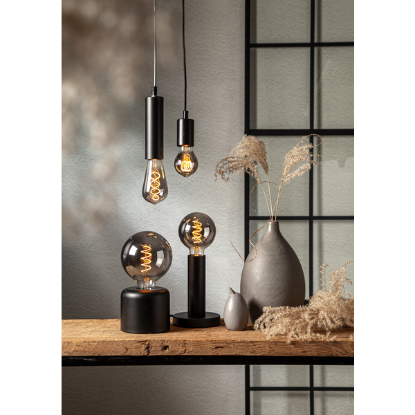 Ljuskälla med rökfärgat glas och en vackert formad spiral som sprider varmt och mjukt sken. Lampan är dimmerkompatibel och har E27-sockel. #heavysmoke
