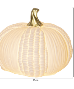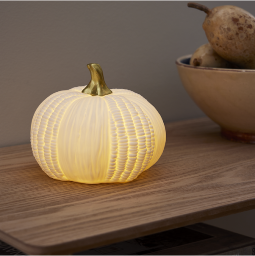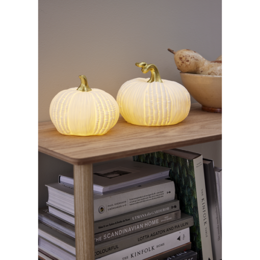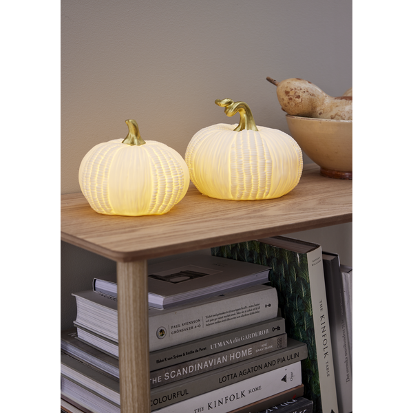 Fin bordsdekoration i vitt porslin. Drivs av 2xAAA batterier. Ger en mysig känsla i ditt hem. Pumpkin finns tillgänglig i två storlekar och är för inomhusbruk.