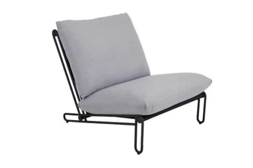 En skön loungefåtölj som sticker ut. Vinklarna och de öppna stommarna i aluminium skapar en klockren plats att koppla av på. Dynorna finns i rosa, grå och beige och är alla klädda i vattenavvisande olefintyg. De här fåtöljerna står bra för sig själva – men tillsammans med Blixt sittdel kan de byggas ut till soffa.
